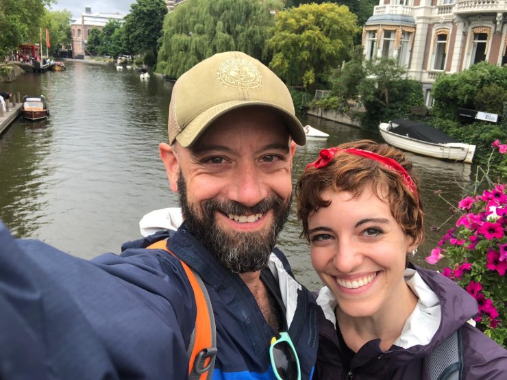 My favorite way to experience a city is to get an overview–and lots of really fascinating insight–via the free walking tours that most cities offer. Then, Aaron and I love to just wander toward the spots on the tour that interested us, or toward distinctive buildings or sculptures we see in the distance, or through a park nearby. We ask for recommendations of what we can do for free, or Google it. Our second day in Amsterdam was spent taking a ferry away from the city center to NDSM-werf, an abandoned shipyard turned street art and performance art hub.
